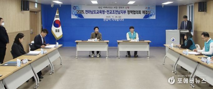 [ 포에버뉴스 오명숙 기자 ] 전라남도교육청과 전국교직원노동조합 전남지부는 28일 전라남도교육청 중회의실에서 노사 양측 관계자들이 참석한 가운데 ‘2025년 정책협의회 체결식’을 가졌다.