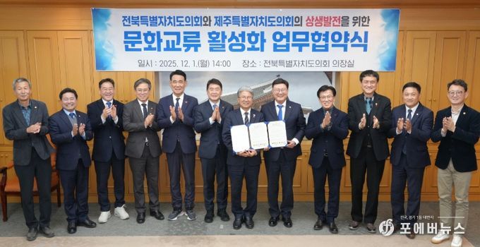 [ 포에버뉴스 이승훈 기자 ] 전북특별자치도의회와 제주특별자치도의회는 문화·관광·세계유산 분야 협력을 강화하기 위해 1일 전북도의회 의장실에서 문화교류 활성화 업무협약(MOU)을 체결했다.