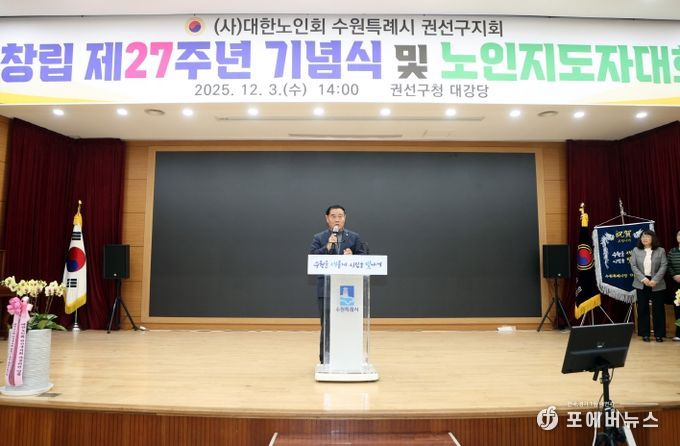 [ 포에버뉴스 김경순 기자 ] 수원특례시의회는 3일 권선구청 대회의실에서 열린‘대한노인회 수원시 권선지구 제27주년 기념식 및 노인지도자대회’에 참석해 어르신 지도자들의 노고를 축하하고 격려했다.