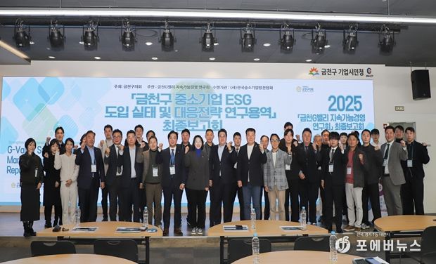 [ 포에버뉴스 김경순 기자 ] 서울특별시 금천구의회 의원연구단체인‘금천G밸리 지속가능경영 연구회’는 지난 12월 1일 금천G밸리 기업시민청에서 '금천구 중소기업 ESG 도입 실태 및 대응전략 연구용역' 최종보고회를 개최했다.