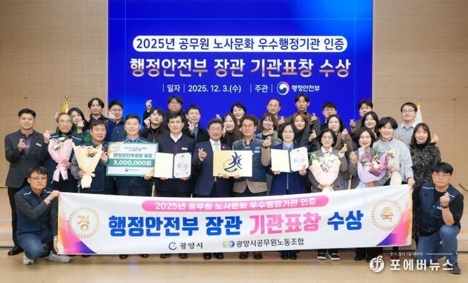 이번 인증을 통해 광양시와 광양시공무원노동조합은 2017년, 2019년, 2022년에 이어 2025년까지 네 차례 연속 우수행정기관으로 인정받으며, 협력적이고 안정적인 노사문화 구축의 모범사례로 그 위상을 더욱 공고히 했다.
