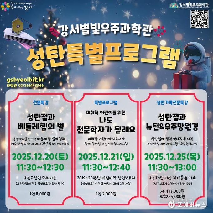 [ 포에버뉴스 김경순 기자 ] 서울 강서구 강서별빛우주과학관(금낭화로 178)은 연말과 성탄절을 맞아 다채로운 천문 프로그램을 운영한다.
