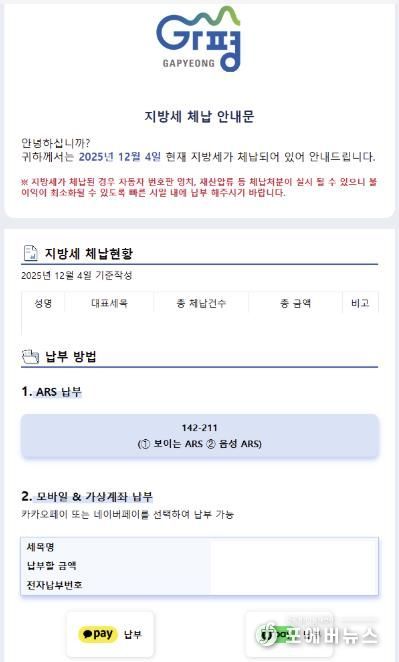 [ 포에버뉴스 김경순 기자 ] 가평군이 지방세 체납액 징수 강화를 위해 최근 체납자 4,790명에게 총 44억 원 규모의 지방세 체납안내문을 카카오톡 모바일 전자고지로 일제히 발송했다.