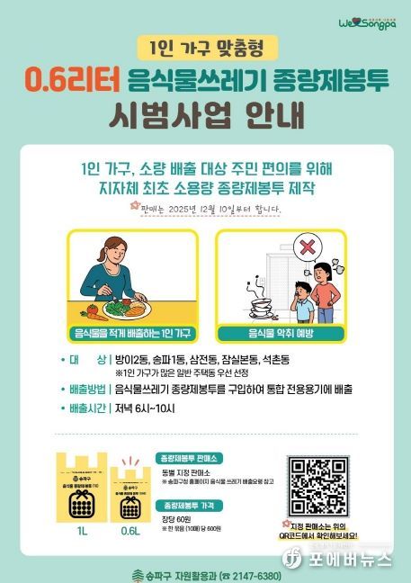 [ 포에버뉴스 김경순 기자 ] 서울 송파구가 전국 지방자치단체 최초로 1인 가구에 최적화된 0.6ℓ 규격의 음식물쓰레기 종량제봉투를 오는 10일부터 시범 도입해 운영한다고 알렸다.