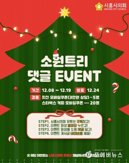 [ 포에버뉴스 김경순 기자 ] 경기 시흥시의회가 다가오는 성탄절을 맞아 시민들과 따뜻한 마음을 나누고 소통을 강화하기 위해 ‘소원트리 댓글 이벤트’를 진행한다.