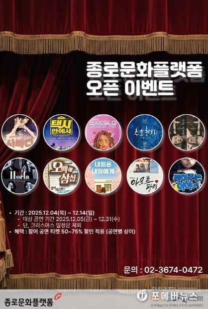 [ 포에버뉴스 김경순 기자 ] 종로구가 ‘종로문화플랫폼’ 구축을 기념해 대학로 공연 최대 75% 할인 이벤트를 진행한다.