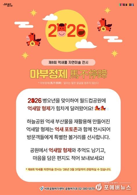 신현호 서울시 서부공원여가센터 소장은 “이번 전시는 ‘마부정제’가 지닌 도전과 전진의 의미를 시민들과 함께 나누고자 마련한 것”이라며 “억새말 형제가 전하는 힘찬 에너지가 2026년을 준비하는 모든 분들께 희망과 활력이 되길 바란다”고 말했다.