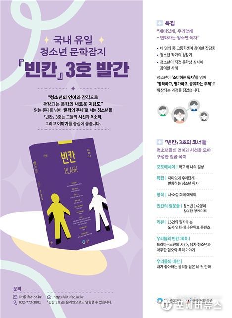 [ 포에버뉴스 김경순 기자 ] 인천문화재단 한국근대문학관은 국내 유일의 청소년 문학잡지 [빈칸] 3호를 발간했다.