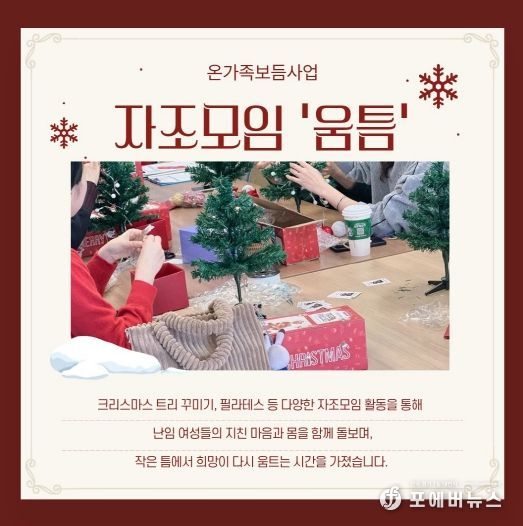[ 포에버뉴스 김경순 기자 ] 인천동구가족센터(센터장 박미희)는 난임 여성의 심리적 부담을 줄이기 위해 온가족보듬사업 자조모임 ‘움틈’을 11월 14일~12월 12일까지 운영했다고 밝혔다.