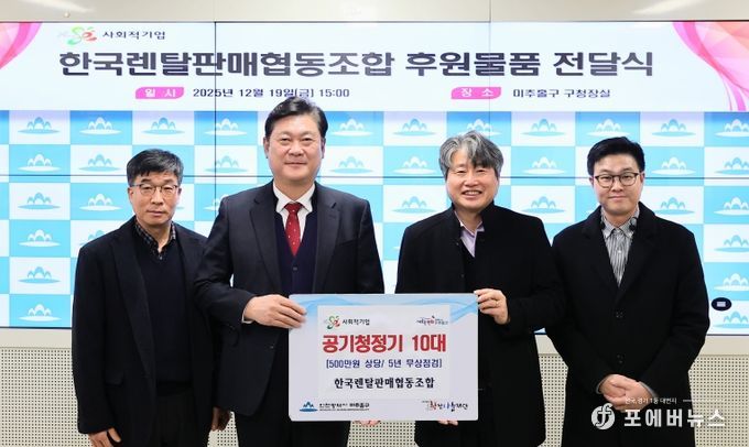 [ 포에버뉴스 김경순 기자 ] 인천 미추홀구는 지난 19일 사회적기업 한국렌탈판매협동조합(대표 정영이)으로부터 공기청정기 10대를 전달받았다.