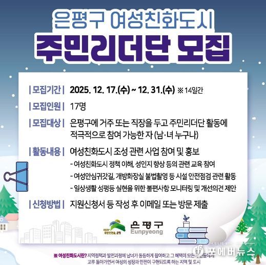 모집 기간은 31일까지로, 온라인 또는 방문 접수가 가능하며 은평구에 거주하거나 직장을 둔 주민 중 주민리더단 활동에 적극적으로 참여할 수 있는 자는 누구나 지원할 수 있다.