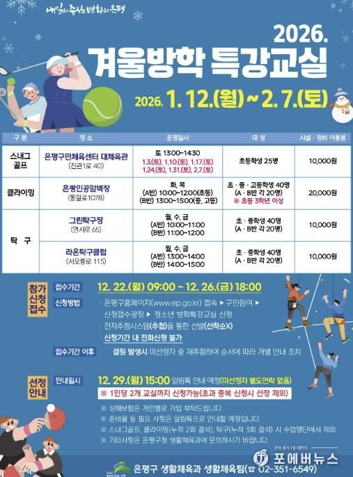 [ 포에버뉴스 김경순 기자 ] 서울 은평구는 겨울방학을 맞아 청소년들의 건강증진과 건전한 여가 활동을 지원하기 위해 ‘2026년 청소년 겨울방학 생활체육 특강교실’을 운영한다고 밝혔다.