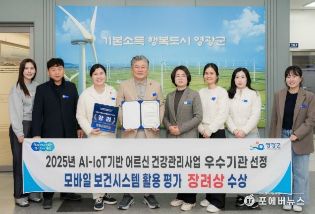 [ 포에버뉴스 오명숙 기자 ] 영광군은 12월 18일 한국사회보장정보원 주관으로 서울PJ호텔에서 열린 2025년 AI-IoT기반 어르신 건강관리사업 모바일 보건소 시스템 활용 평가 성과대회에서 장려상을 수상하며 2년 연속 우수기관으로 선정됐다.