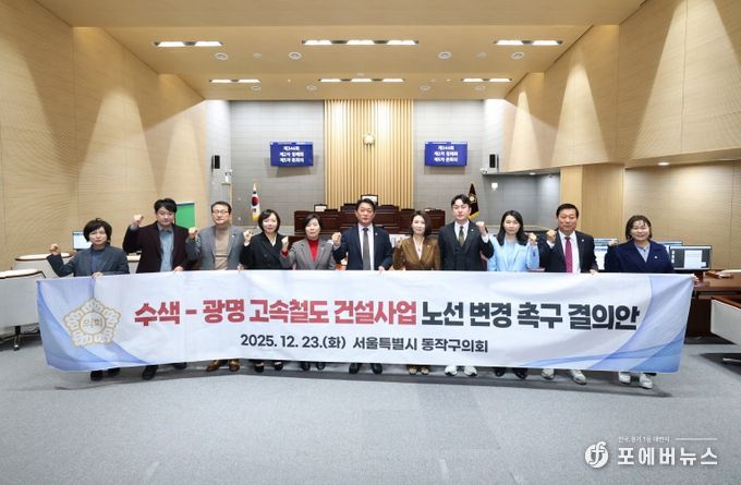 의원들의 구정질문에 이어 정재천 의장이 대표발의한 '수색-광명고속철도 건설사업 노선 변경 촉구 결의안'이 채택됐다. 결의안은 현행 노선이 노량진·대방동 등 대규모 주거 밀집지역을 관통해 주민 안전과 주거환경을 위협하고 있으며, 주민의 의견이 충분히 반영되지 않은 부실한 계획이라고 지적하고, 동작구가 제안한 우회 대안 노선을 기본계획에 반영할 것을 국토교통부에 강력히 촉구하는 내용을 담고 있다.
