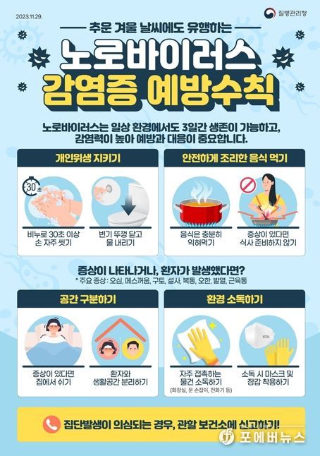 질병관리청 장관염증 표본 감시 결과에 따르면 최근 4주간 노로바이러스 감염증 환자 수는 증가 추세를 보이고 있으며 지난해 같은 기간(11월 5주)과 비교해 58.8퍼센트 증가한 것으로 나타났다.