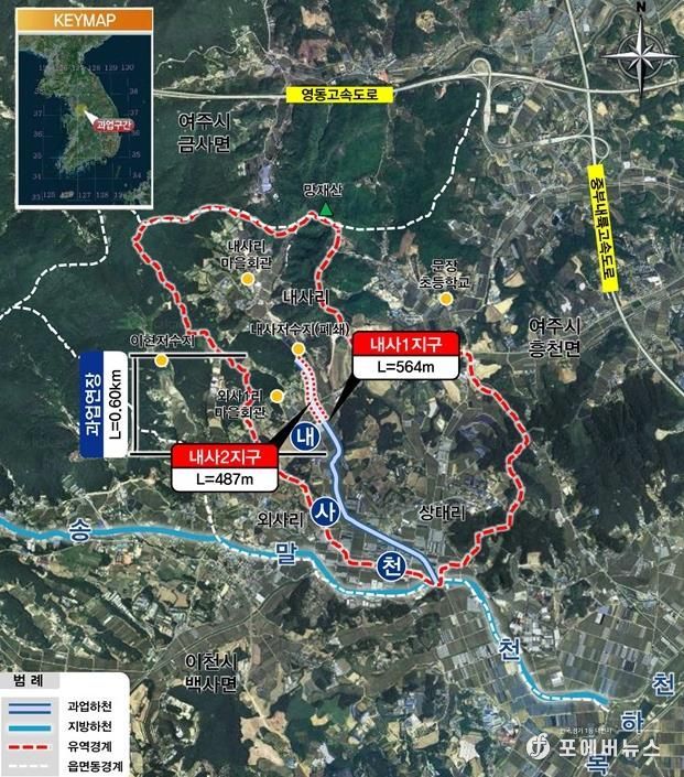 정비사업은 여주시 흥천면 내사리 일원 총 연장 0.6km 구간의 하천을 정비(하폭 6~14 → 15~20m)하는 것으로 ▲축제공(제방 쌓기) 1.05km ▲교량 3개 설치 등이 포함된다.
