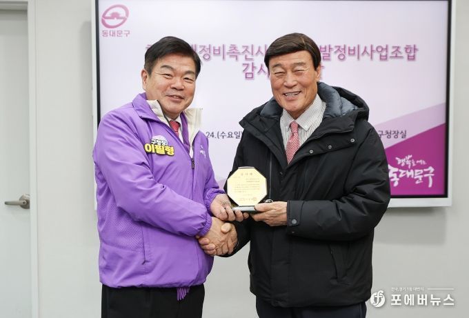 동대문구는 24일 구청장실에서 감사패 수여식을 열고, 휘경3재개발조합을 대표해 이남재 조합장에게 감사패를 전달했다. 행사에는 오선환 상임이사, 김응하 이사, 박종목 감사, 김태동 사무장 등 조합 관계자도 함께했다.