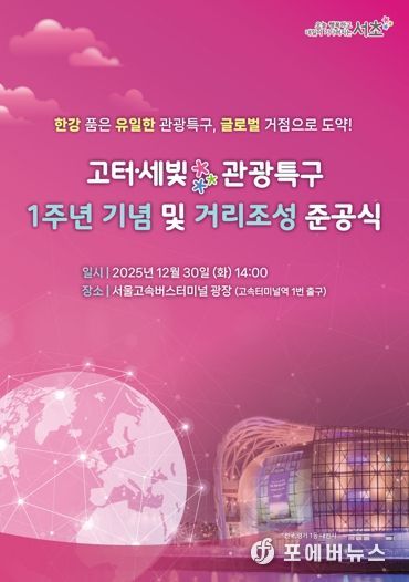 [ 포에버뉴스 김경순 기자 ] 서울 서초구는 고터·세빛 관광특구 지정 1주년을 맞아 오는 30일 14시 서울고속터미널 광장 일대에서 관광특구의 본격적인 도약을 알리는 '고터·세빛 관광특구 1주년 기념 및 거리조성 준공식'을 개최한다고 밝혔다.