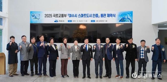 [ 포에버뉴스 오명숙 기자 ] 여수시는 호남권 최초로 국토교통부 주관 ‘2025년 스마트도시 인증’에 선정되면서 지난 24일 시청 본관 1층 로비에서 동판 제막식을 개최했다.