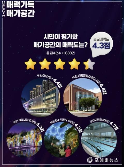 [ 포에버뉴스 김경순 기자 ] 부천시는 시민이 직접 참여한 ‘MEGA(매가) 공간’ 매력도 조사 결과를 발표했다. 이번 공모는 공간에 대한 시민의 체감도와 이용 경험을 파악하고, 이를 바탕으로 향후 공간 운영과 정책 방향을 설정하기 위해 실시됐다.