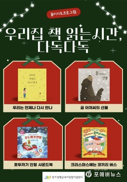 [ 포에버뉴스 박정배 기자 ] 양평군육아종합지원센터는 연말을 맞아 관내 영유아 가정을 대상으로 가정에서 실천할 수 있는 부모교육과 놀이·독서 연계 프로그램을 운영했다.