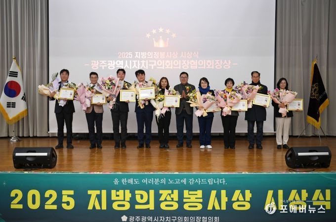 [ 포에버뉴스 오명숙 기자 ] 광주광역시자치구의회의장협의회(회장 김명수)가 26일 광산구청 7층 윤상원홀에서 ‘2025년 하반기 지방의정봉사상’ 시상식을 개최했다.