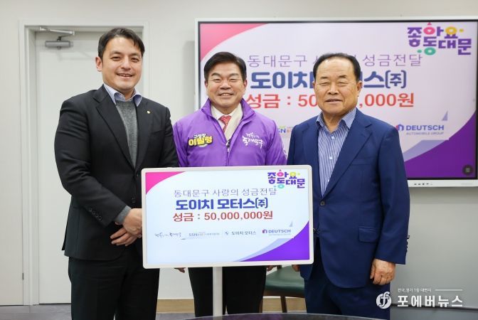 [ 포에버뉴스 김경순 기자 ] 서울 동대문구는 도이치모터스로부터 사랑의 성금 5000만원을 전달받았다고 밝혔다. 도이치모터스가 2011년부터 올해까지 15년째 이어온 기부는 2011~2024년 누적 2억6500만원에 달하며, 올해도 5000만원을 보태 지역 나눔을 이어갔다.