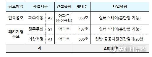 ②택지공모는 약 2천호 규모로 실시하며, 사업 대상지는 파주와동 A2 블록, 원주무실 S1 블록, 의왕초평 A1 블록 총 3곳이다. 파주와동 A2 블록과 원주무실 S1 블록은 실버스테이로, 의왕초평 A1 블록은 임대의무기간이 20년인 일반 공공지원민간임대로 공급한다.