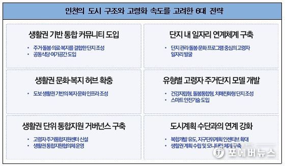 인천연구원은 인천의 도시 구조와 빠른 고령화 속도를 고려해 생활권 기반 통합 커뮤니티 도입, 단지 내 고령자 일자리 연계, 생활권 문화·복지 허브 확충, 유형별 고령자 주거단지 모델 개발, 생활권 단위 통합지원 거버넌스 구축, 도시계획 수단과의 연계 강화 등 여섯 가지 전략을 제안했다.