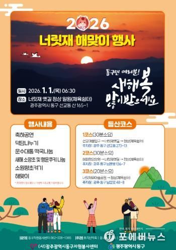 [ 포에버뉴스 오명숙 기자 ] 광주 동구는 2026년 병오년 새해를 맞아 1월1일 오전 7시 너릿재 옛길 정상(체육쉼터)에서 해맞이 행사와 함께 방문객에게 떡국을 나누는 ‘2026년 병오년 해맞이 떡국나눔 행사’를 개최한다고 밝혔다.