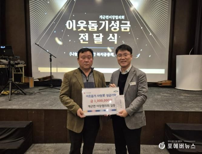[ 포에버뉴스 박정배 기자 ] 양평군 개군면은 새해를 맞아 개군면 이장협의회가 지역 내 어려운 이웃을 돕기 위해 성금 100만 원을 기탁하며 따뜻한 나눔을 실천했다고 밝혔다. 기탁된 성금은 개군면 내 취약계층을 위한 복지 지원에 사용될 예정이다.