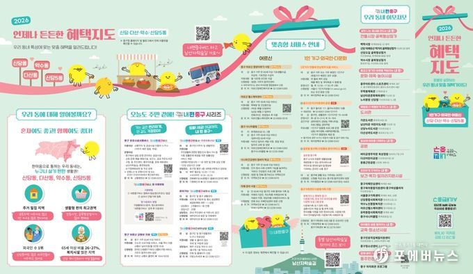 ‘2026 언제나 든든한 혜택지도’는 동주민센터, 복지관 등 주민 이용시설에 비치되며, 중구 홈페이지와 블로그에도 게재돼 언제든지 쉽게 찾아볼 수 있다.