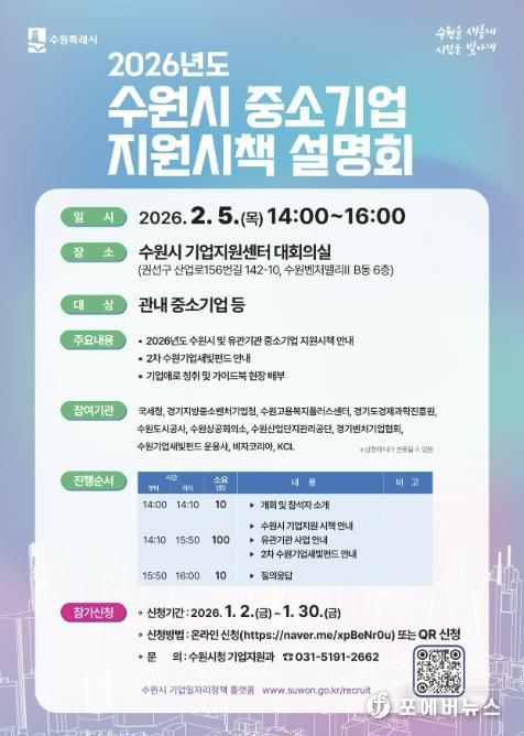 ‘2026년 중소기업 지원시책 설명회’는 2월 5일 오후 2시부터 4시까지 수원시 기업지원센터 대회의실에서 열린다.