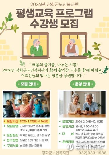 [ 포에버뉴스 김경순 기자 ] 강화군노인복지관(관장 윤심)이 오는 12일~16일, 어르신들의 활기찬 노후와 평생학습 기회 확대를 위한 ‘2026년 평생교육 프로그램’ 수강생을 모집한다고 밝혔다.