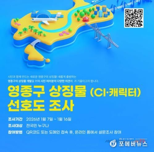 [ 포에버뉴스 김경순 기자 ] 인천시 중구는 올해 7월 출범할 ‘영종구’의 정체성과 지역 이미지를 담은 영종구 상징물(CI, 캐릭터) 선정을 위해 선호도조사를 실시한다고 6일 밝혔다.