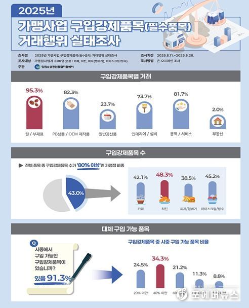 특히, 구입이 강제되는 품목 중 91.3%는 시중에서도 구입이 가능한 것으로 확인되어, 가맹본부의 구입강제품목 지정에 대한 탄력성 제고가 필요한 것으로 분석됐습니다.
