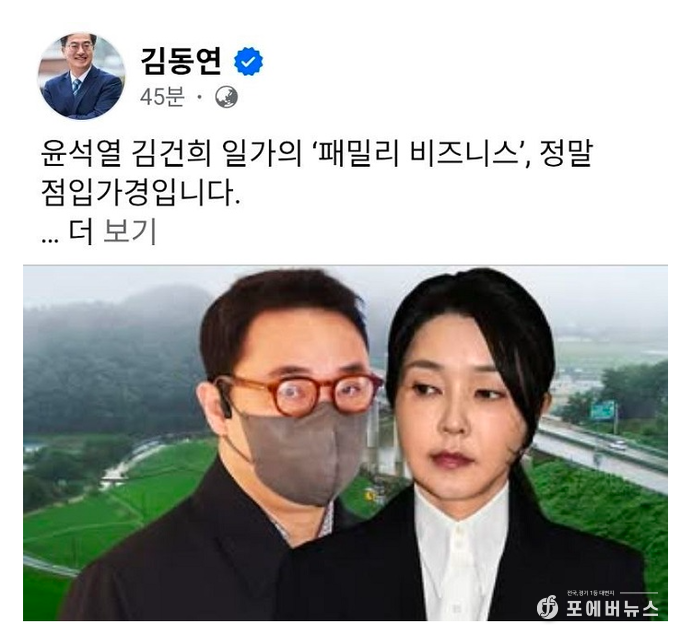 김 지사는 7일 자신의 페이스북을 통해 “윤석열·김건희 일가의 ‘패밀리 비즈니스’ 의혹이 점입가경”이라며 “김건희 일가가 양평 고속도로 변경 종점부 인근에서 주택사업을 계획한 문건이 드러났다”고 밝혔다.