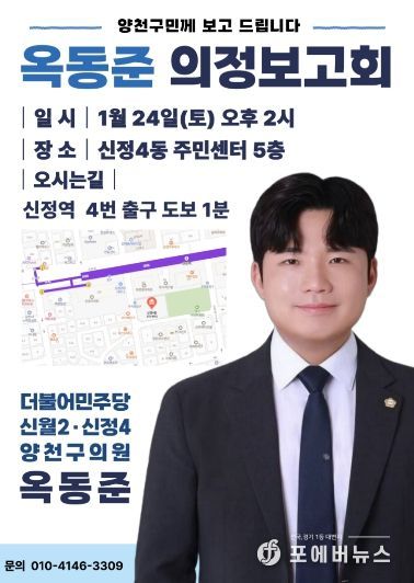 [ 포에버뉴스 김경순 기자 ] 양천구의회 옥동준 의원(더불어민주당, 신정4·신월2동)이 오는 24일 오후 2시 양천구 신정4동 주민센터에서 의정보고회를 열어 그간의 의정활동 성과와 향후 계획을 양천구민께 보고하는 자리를 마련한다.