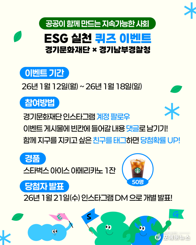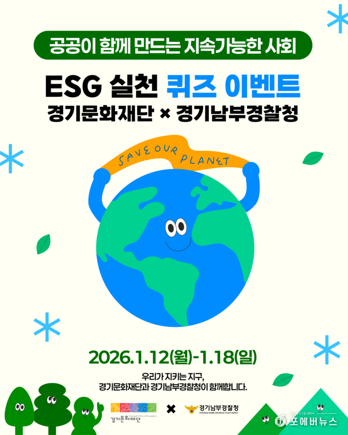 경기문화재단(대표 유정주, 재단)이 11일 경기남부경찰청(남부청)과 ESG 실천 및 SNS 공동 이벤트를 공동으로 진행한다고 밝혔다.