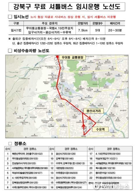 비상수송대책의 핵심으로, 구는 ‘임시 무료 셔틀버스(임시 1번)’를 운영하고 있다. 셔틀버스는 우이동 교통광장에서 수유역까지 약 7.5km 구간을 운행하며, 전세버스 10대가 투입돼 오전 6시부터 밤 10시까지 운행된다.