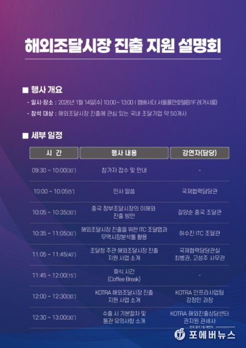 [ 포에버뉴스 사공선 기자 ] 조달청은 14일 앰배서더 서울 풀만호텔에서 조달기업 60여 개사를 대상으로 해외조달관 초청 ‘해외조달시장 진출 지원사업 설명회’를 개최했다.