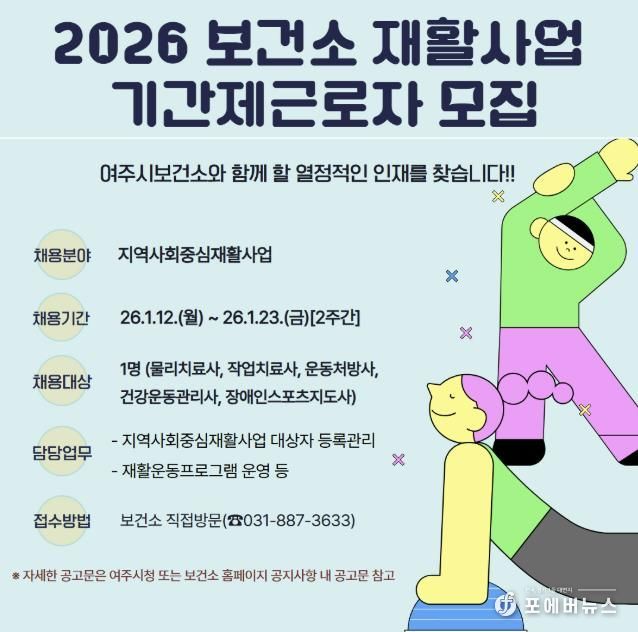 [ 포에버뉴스 박정배 기자 ] 여주시보건소는 지역 내 등록장애인과 예비장애인들의 건강관리를 위한 지역사회중심재활사업 추진을 위해 1월 12일부터 1월 23일까지 2주간 기간제근로자 채용 공고를 실시한다.