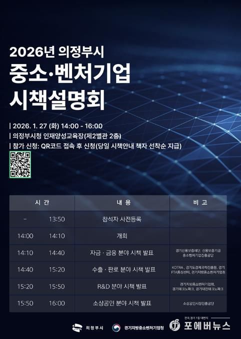 [ 포에버뉴스 김경순 기자 ] 의정부시는 1월 27일 시청 인재양성교육장에서 ‘2026년 중소‧벤처기업 시책설명회’를 개최한다.