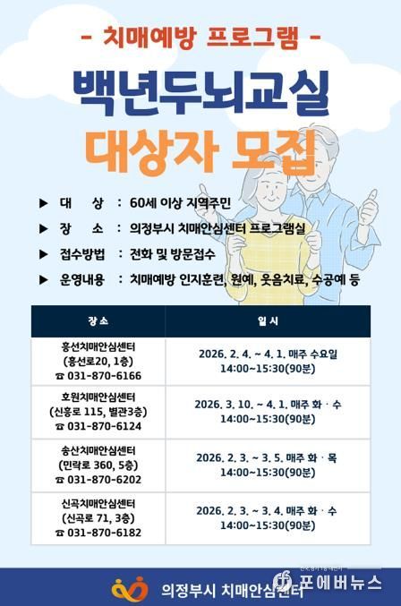 [ 포에버뉴스 김경순 기자 ] 의정부시 보건소 치매안심센터는 치매 예방과 인지기능 유지‧향상을 위한 2026년 상반기 치매예방 프로그램 ‘백년두뇌교실 1기’를 운영한다.