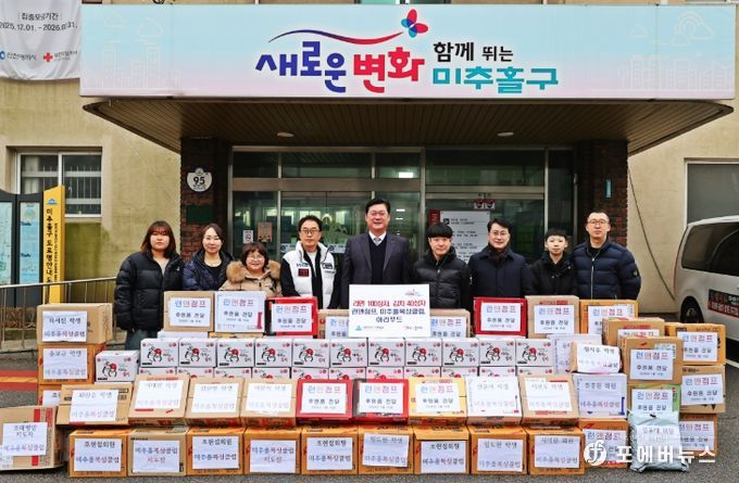 이번 전달식에는 런앤점프, 미추홀복싱클럽, 아리푸드 등 지역 사회 후원처가 참여해 라면 100상자와 김치 40상자를 전달했다.