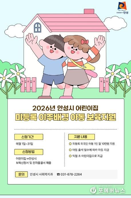 [ 포에버뉴스 김경순 기자 ] 안성시는 2026년부터 어린이집에 다니는 미등록 외국인(이주배경) 영유아에게 월 10만원의 보육지원금을 지원한다고 밝혔다.
