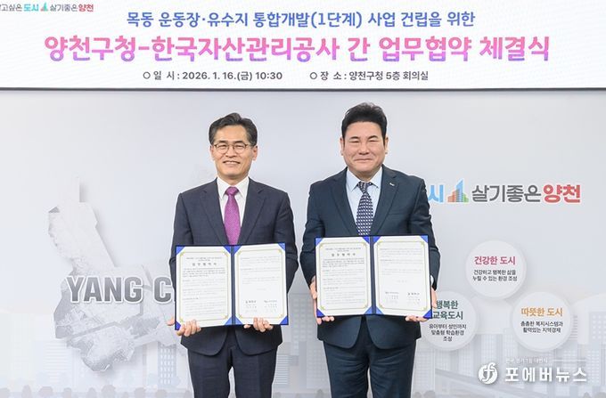 [ 포에버뉴스 김경순 기자 ] 양천구가 1월 16일 한국자산관리공사와 업무협약을 체결하며, 목동운동장·유수지 일대 통합개발(목동MICE)을 위한 첫걸음을 내디뎠다.