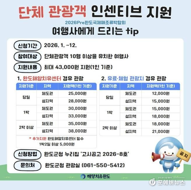 군 관계자는 “완도는 해양과 산림 치유, 섬 테마 치유가 어우러진 국내에서 유일한 치유의 섬으로 많은 관광객이 오래 머무르며 힐링할 수 있도록 인센티브 지원 사업을 확대한다”면서 “단체 관광객 유치로 관광과 경제 활성화에 보탬이 될 수 있도록 하겠다”라고 말했다.