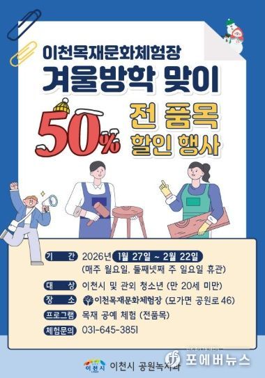 [ 포에버뉴스 박정배 기자 ] 이천시는 겨울방학을 맞아 어린이 및 청소년들에게 특별한 체험 기회를 제공하기 위해 목재문화체험장 이용료를 50% 할인하는 행사를 진행한다고 밝혔다.