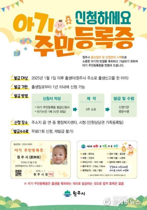 원주시 관계자는 “원주시 미래세대 구성원으로서 아이의 출생을 축하하는 의미를 담아 아기주민등록증을 발급하고 있다”라며, “아기 주민등록증이 아이와 부모에게 소중한 성장의 기록이 되길 바란다”라고 말했다.